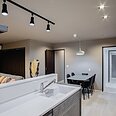 キッチン周りはグレーで統一しかっこよさを出しながら横のパントリーの下がり壁をアーチにして可愛らしさも取り入れたデザインに。