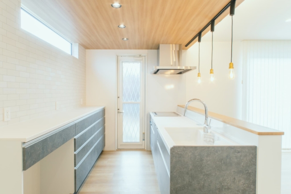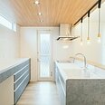 下がり天井で空間をゾーニング。おしゃれな対面式のキッチンで、お料理中も気分があがりそうですね。