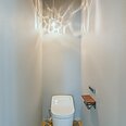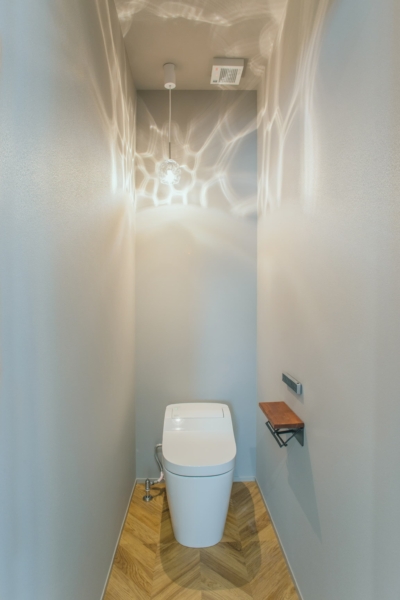 グレーのクロスと、ヘリンボーン柄の床の相性が良い、おしゃれなトイレです。