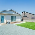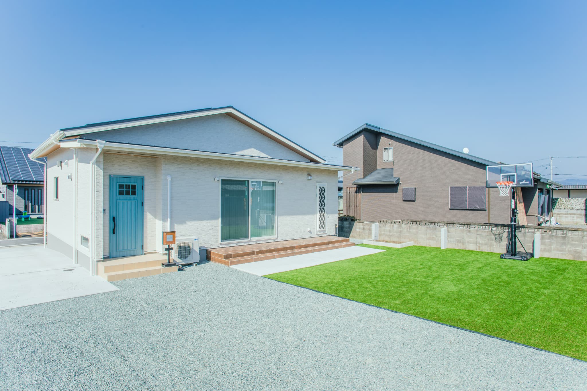 青空に映える、切妻屋根のシルエットが美しい平屋のおうち。外構も爽やかで、芝にはバスケットゴールを。