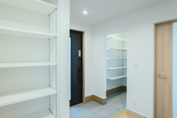 シューズクロークや、備え付けの棚など、収納力ばつぐんな玄関周り。お買い物のあと、お荷物が多くても混雑しない広さの玄関。