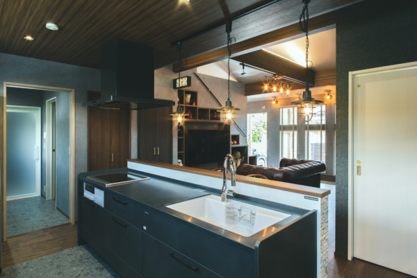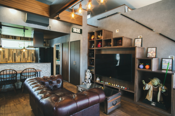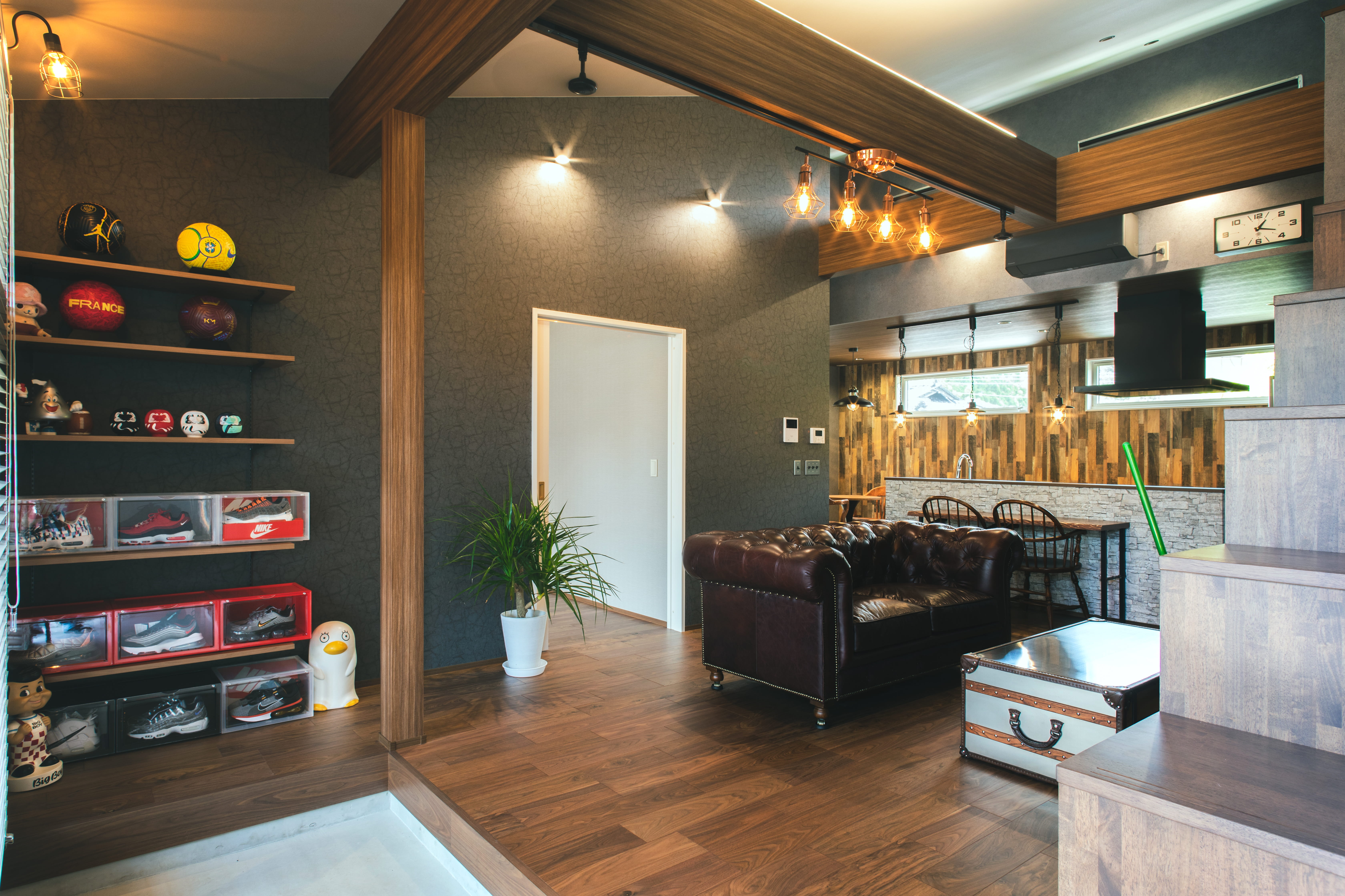 飾り梁で奥行き感を演出した天井。インダストリアルな雰囲気に包まれた、施主様こだわりのリビングです。