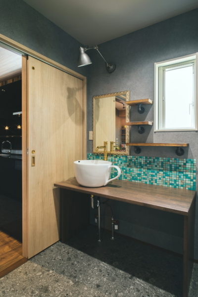 造作の洗面台は、クロスや洗面ボウルなど、遊び心満載の空間。