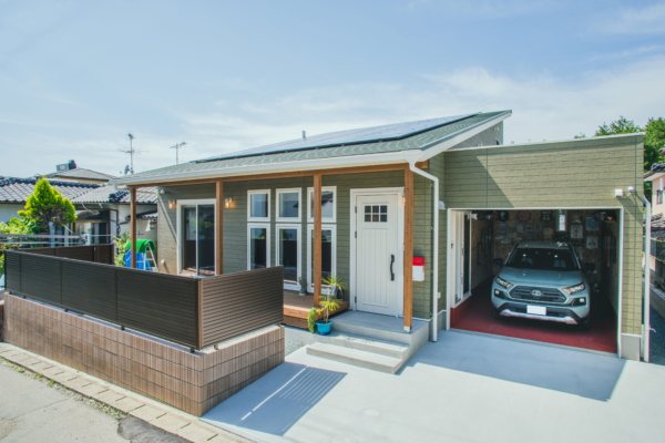 緑色の外壁に、窓枠、玄関ドア、ガレージを白で統一することで、格好良さの中に可愛らしさを取り入れたデザイン性のある外観に。。