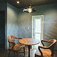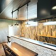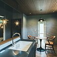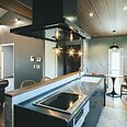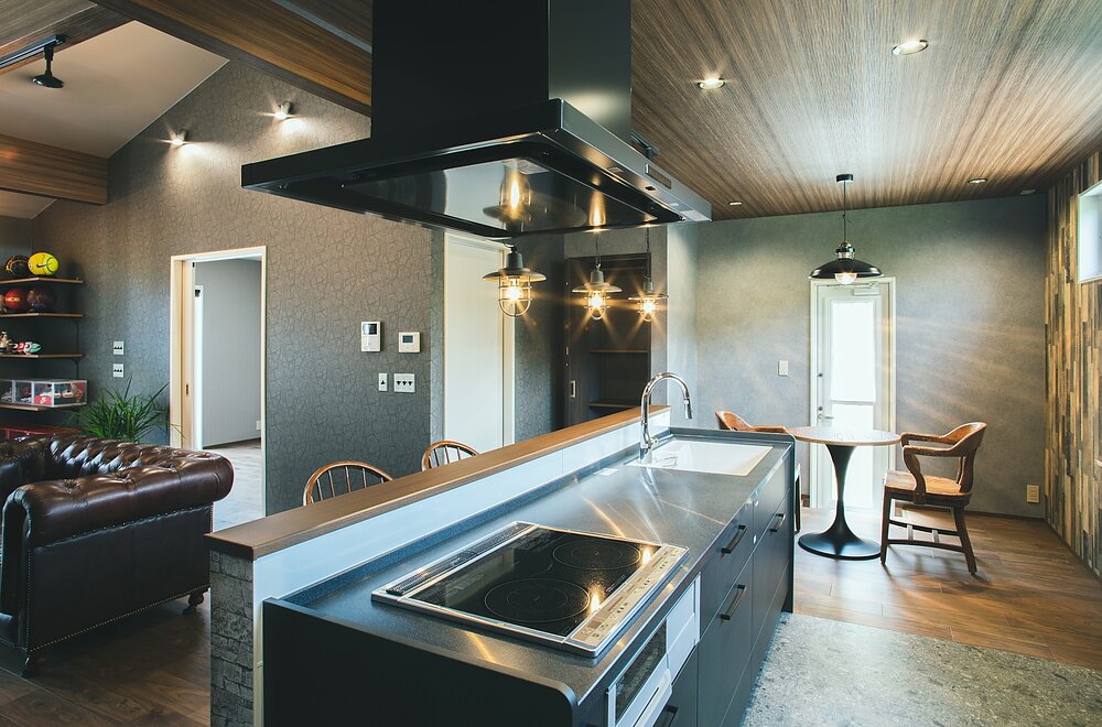 部屋全体の色味は統一しつつ、キッチン天井や壁の木目の柄を変更することで遊び心を入れた空間に。
