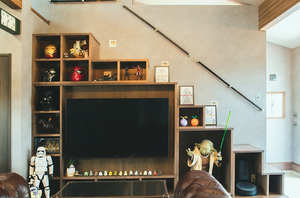 このお家のメインの造作階段収納。壁掛けテレビと掃除ロボット基地、収納したいものの大きさを細かく考えながら制作。