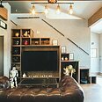 造作の階段収納は、テレビや掃除ロボットなど、用途に合わせて無駄なく設計。