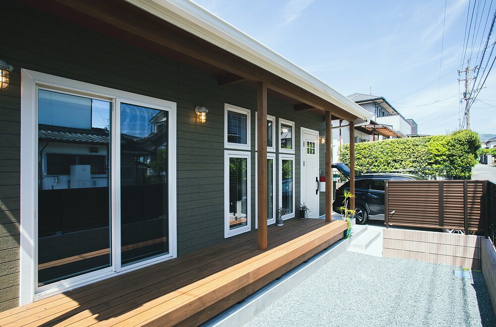 緑色の外壁に、窓枠、玄関ドア、ガレージを白で統一することで、格好良さの中に可愛らしさを取り入れたデザイン性のある外観に。。