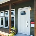 緑の外壁に、窓枠や玄関ドア、ガレージを白で統一。