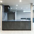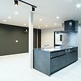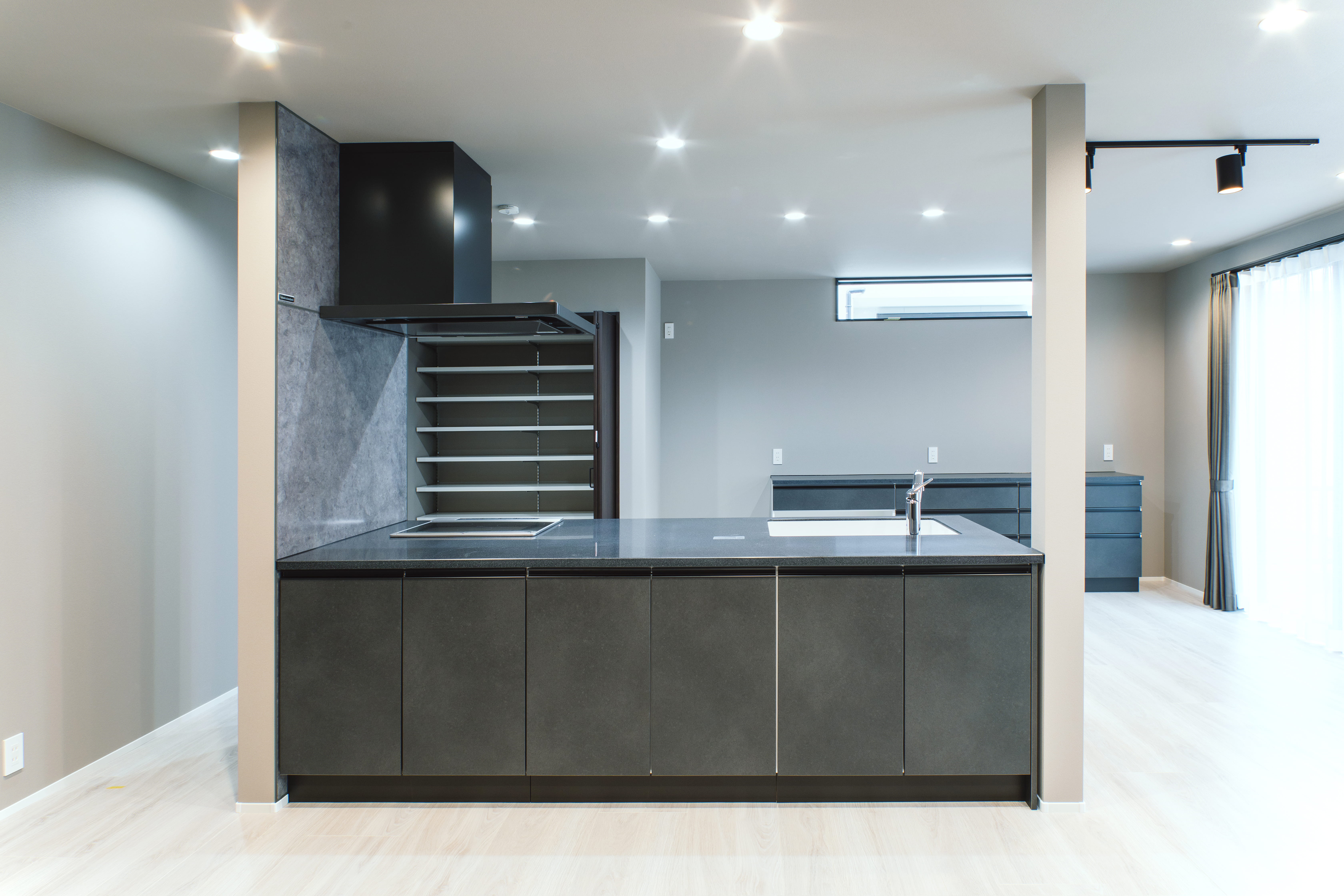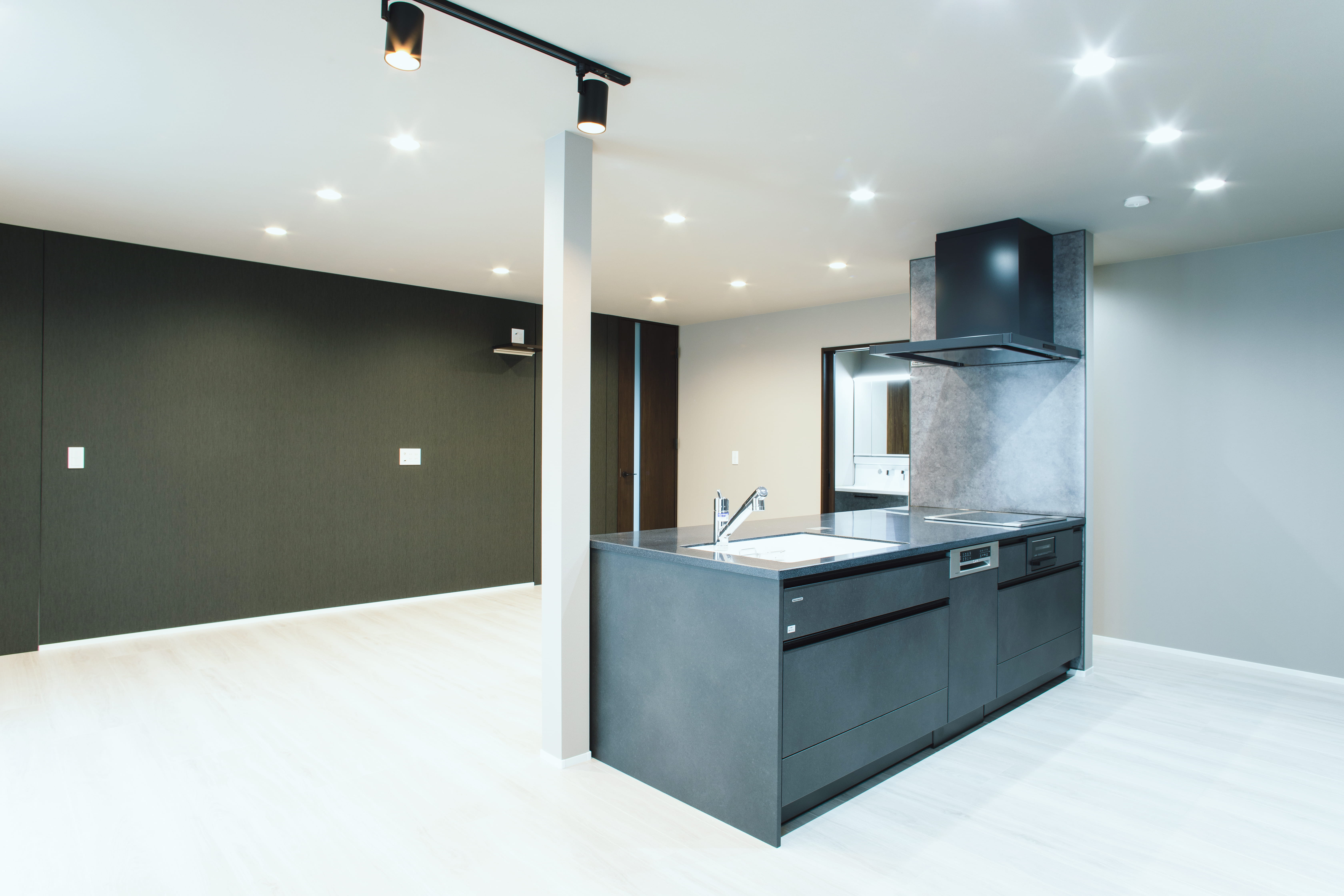 ホワイトのフローリングと、ダークグレーのクロスが相性の良いリビング。キッチンの存在感もあり、洗練された印象。