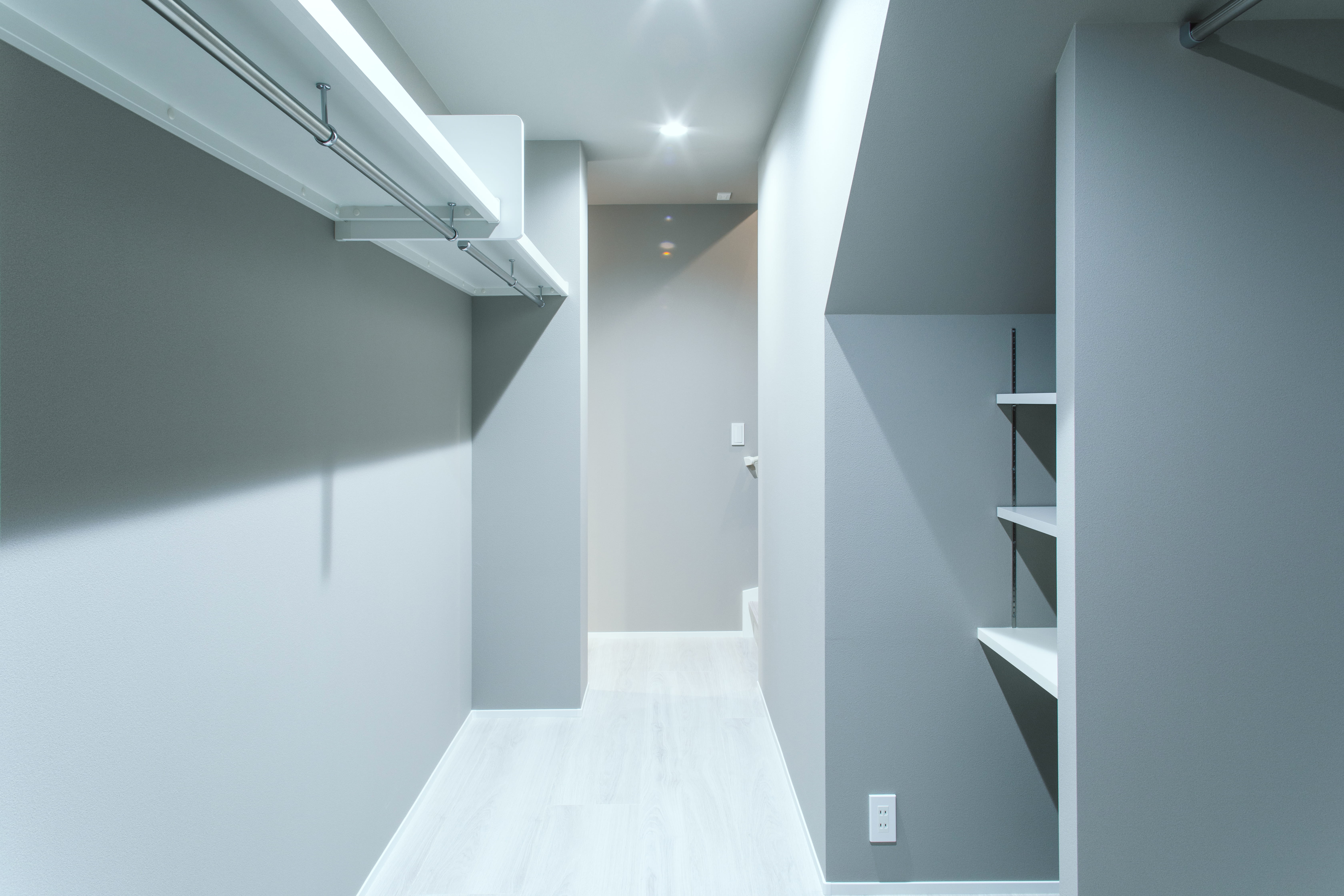 グレーのクロスで落ち着いた印象。ハンガーパイプだけでなく、可動棚も設置。収納するものに合わせて設計されており使い勝手ばつぐんです。