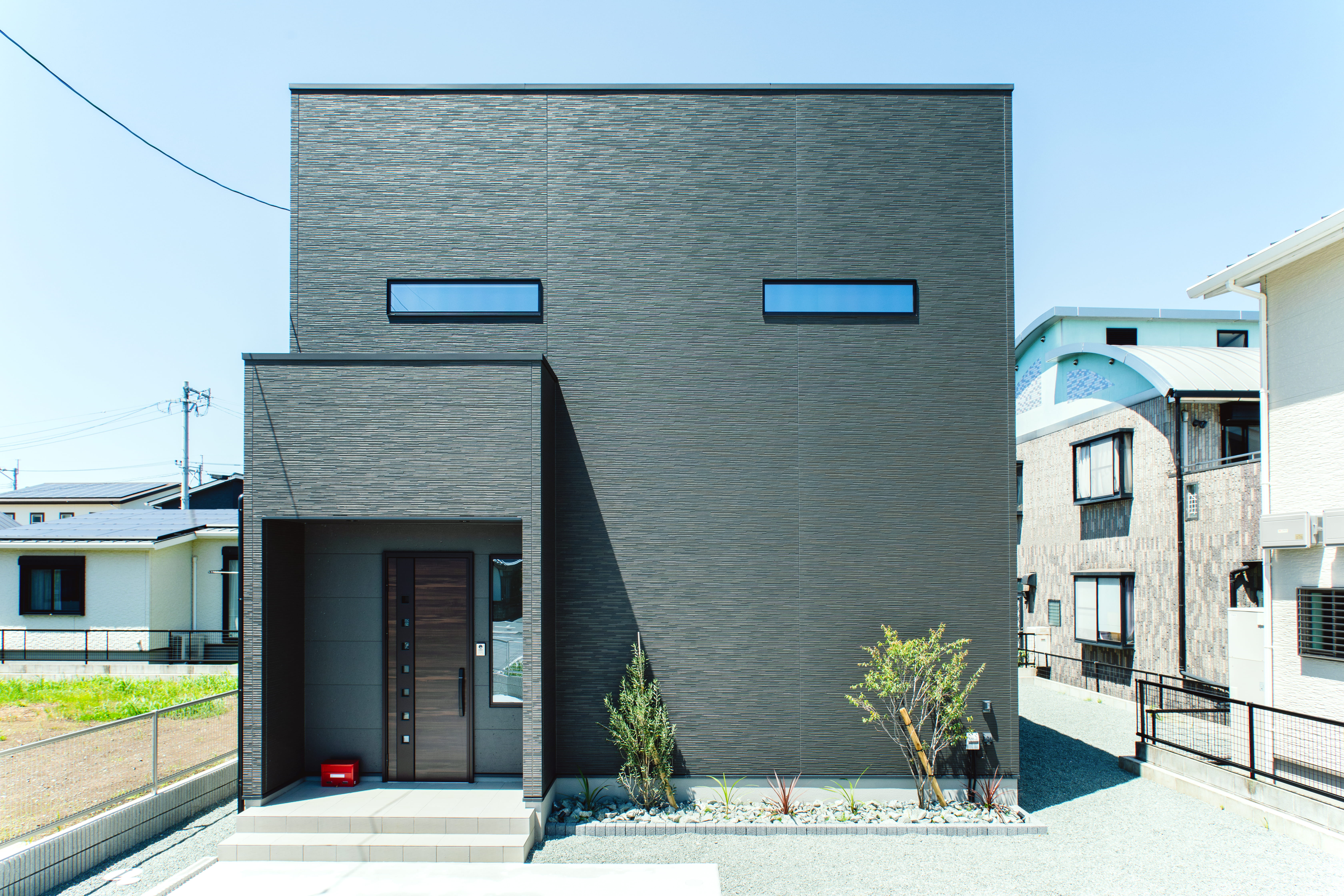 ブラック×直線美が映える外観。存在感のある外観で、洗練された印象。正面には大きな窓がなく、プライバシーがしっかり守られる設計です。