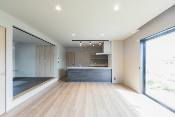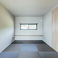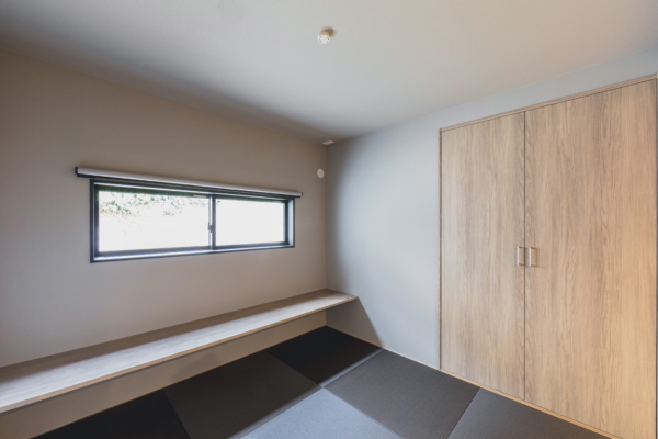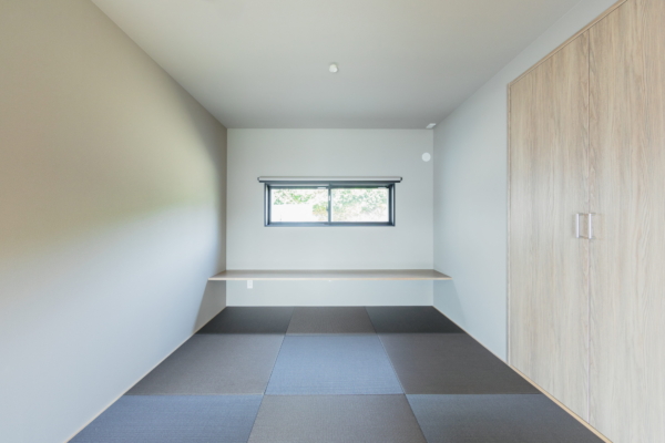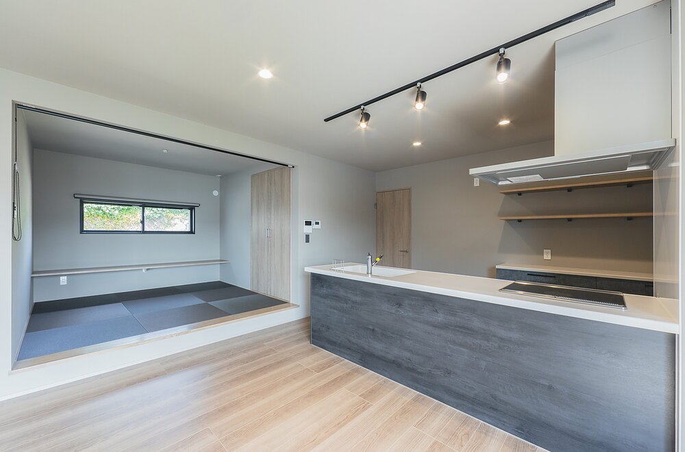 市松敷の畳もダークトーンでまとめられており個性的な和室に。リビング横に設計し、家族だんらんにも、来客時にも使えます。