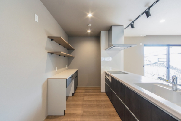 背面に造作の棚を設置し、カップボードとは異なり、見せる収納を楽しめる設計。お気に入りの食器やインテリアを置いて楽しめます。