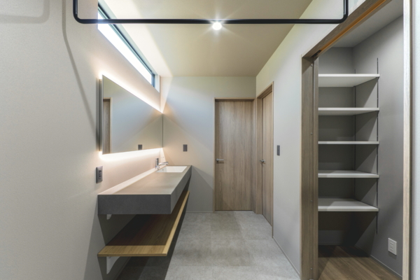 まるでホテルのような洗面台。朝の支度のたびに気分が上がります。ランドリーパイプも備え付けられていますので、室内干しも楽々でき、機能面も充実しています。