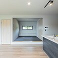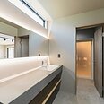 落ち着いたグレーのクロス、ブラックの畳、ホテルライクな洗面所は、