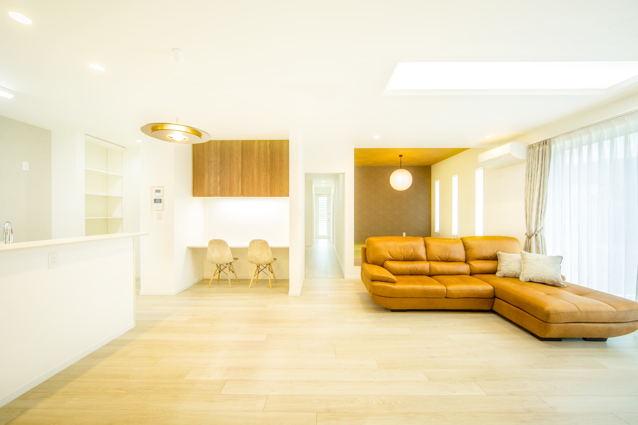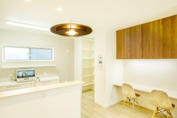 キッチン横には、収納もあるワークスペースが設置されていて、お子様の宿題をする場所にも、在宅ワークする場所にもなります。