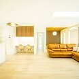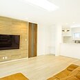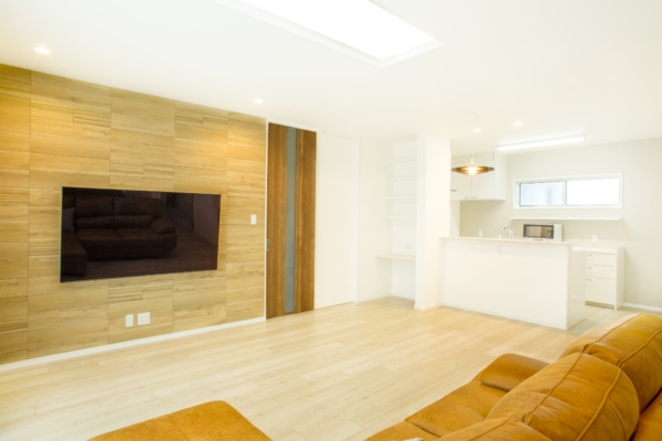 木目フローリングにやわらかな照明で、家族がくつろげるリビングに。