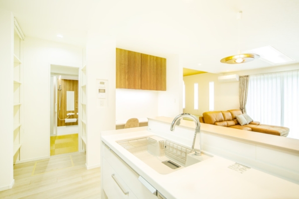 キッチン・パントリー・ランドリールームがつながっており、水回りの動線短縮が嬉しいポイント。対面式のキッチンは、家族の様子をいつでも見れる安心設計。
