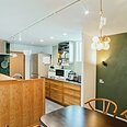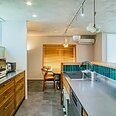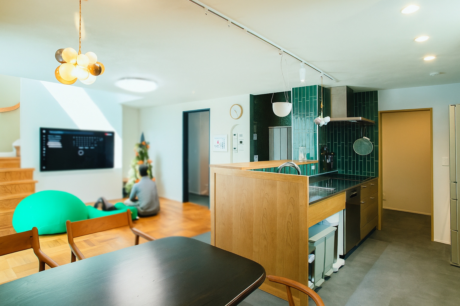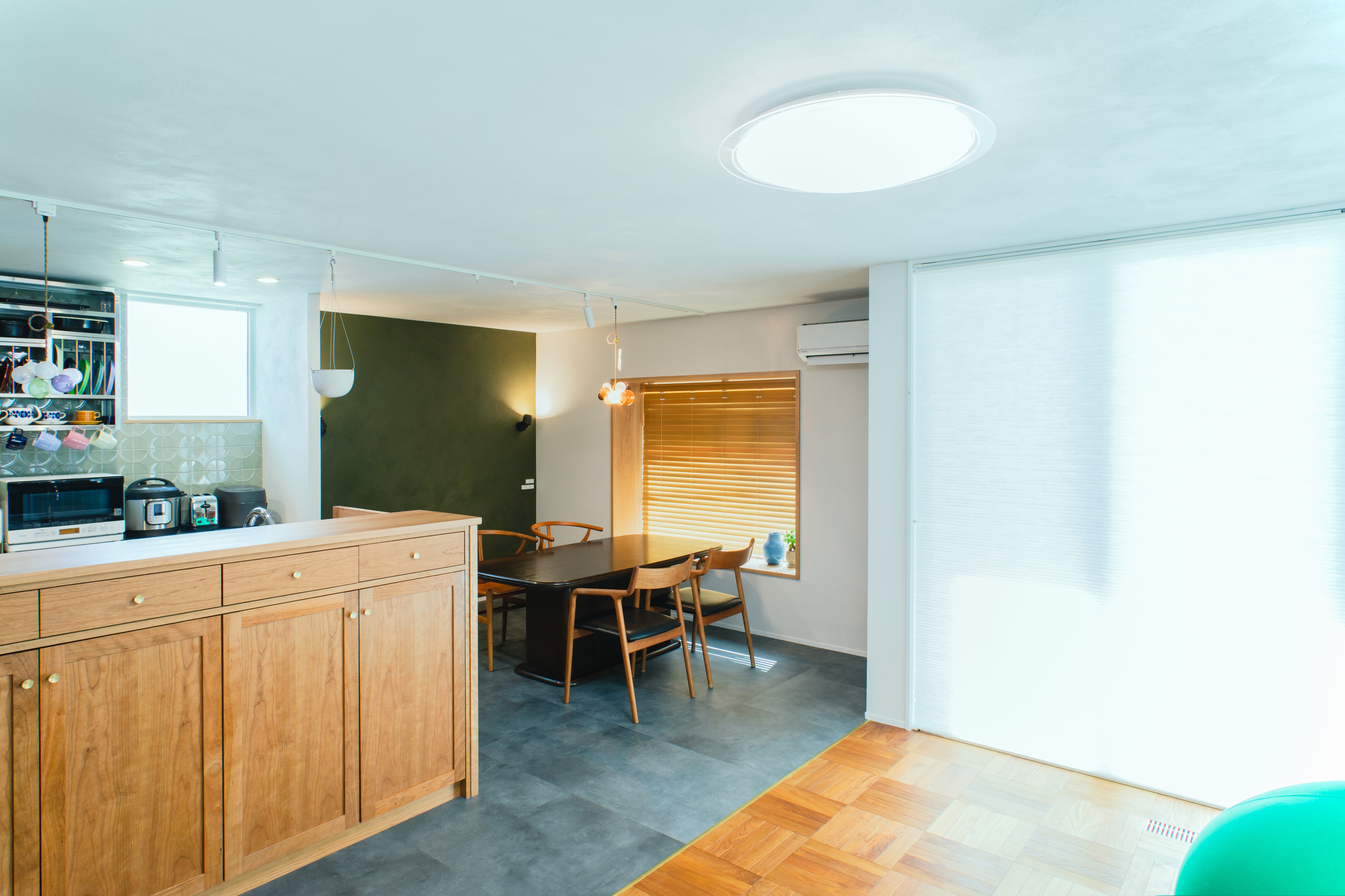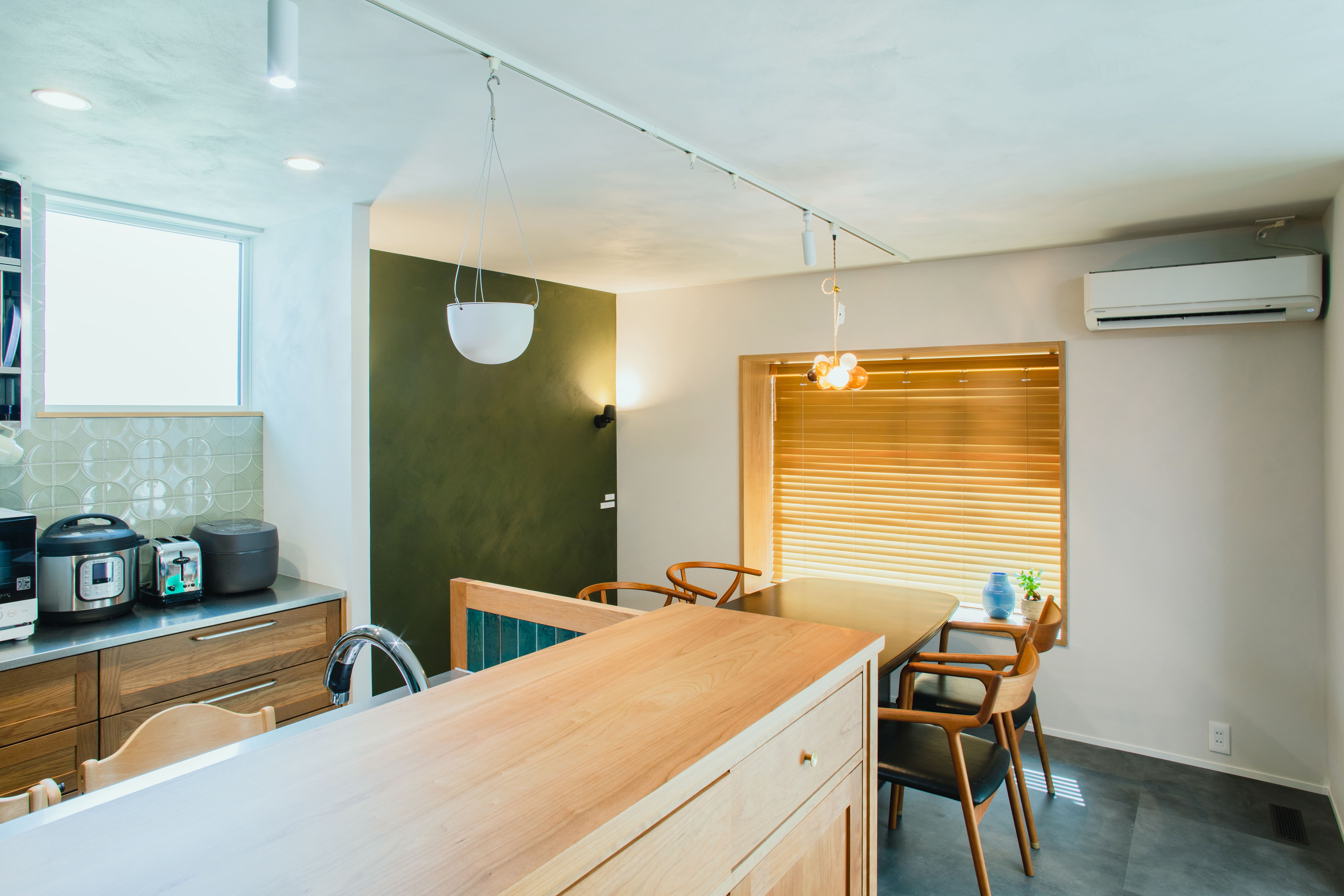 木目とグリーンのタイルが映える、対面式キッチン。横並びのダイニングは、まるでカフェのような落ち着く空間に。