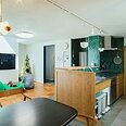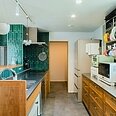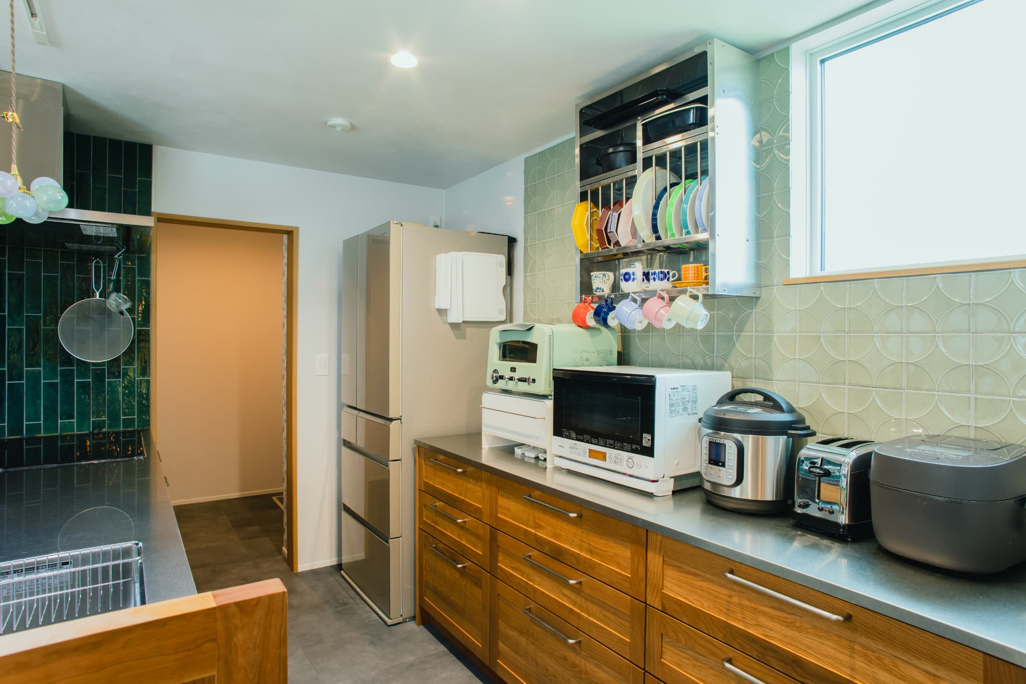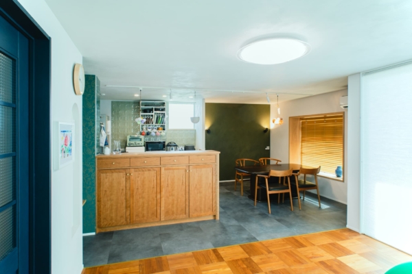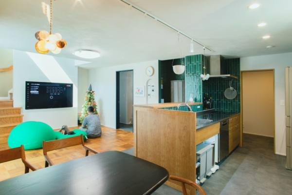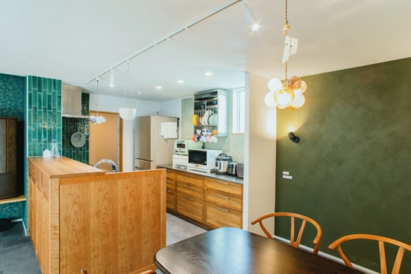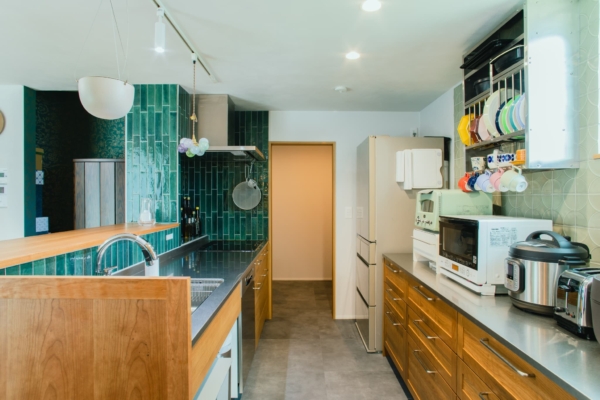 木目とグリーンのタイルが映える、対面式キッチン。横並びのダイニングは、まるでカフェのような落ち着く空間に。