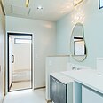 ミラーの形に個性を感じ、清潔感・高級感あふれる印象に。ゴールドを散りばめることで上質な空間を演出しています。