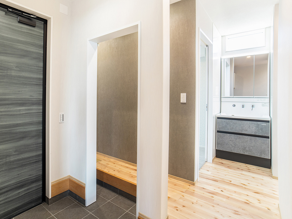 リビング裏の水回りは、収納・洗濯・洗面・浴室が一直線に並んでおり、動線が考えつくされており、日々の暮らしを上質なものに。