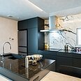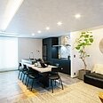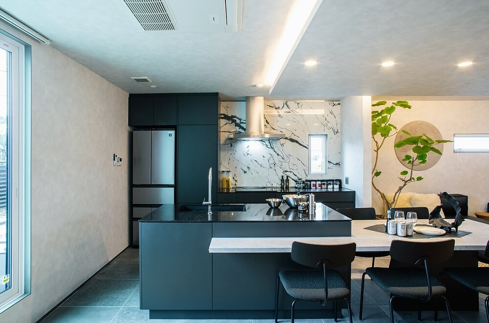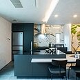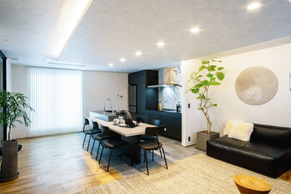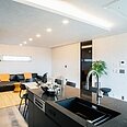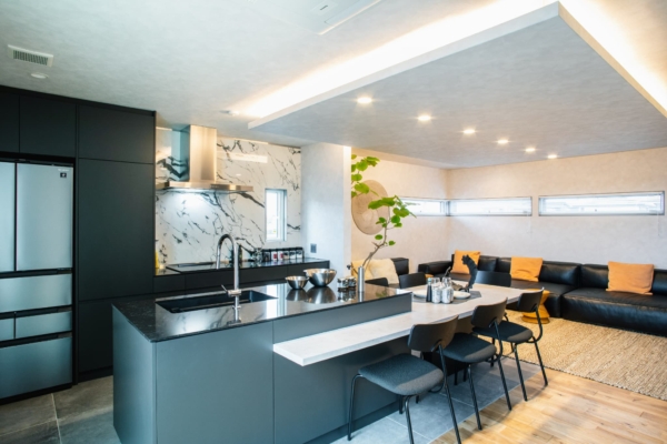 ブラックで統一したキッチン。折り下げ天井と間接照明が、くつろぎのリビング空間をゾーニング。