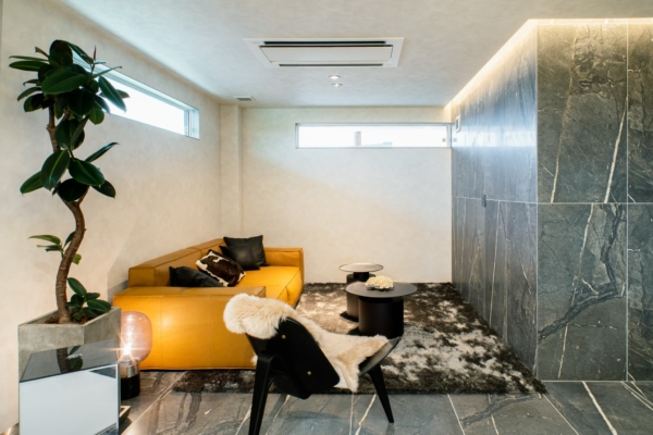 折り上げ天井の間接照明が空間を演出。道路側には大きな窓はなく、プライバシーを重視した間取り。