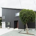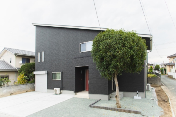 黒の外壁に片流れの屋根でスタイリッシュにまとめた外観。玄関ドアの赤は、リビングのキッチンとリンクさせており、いいアクセントになっています。