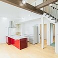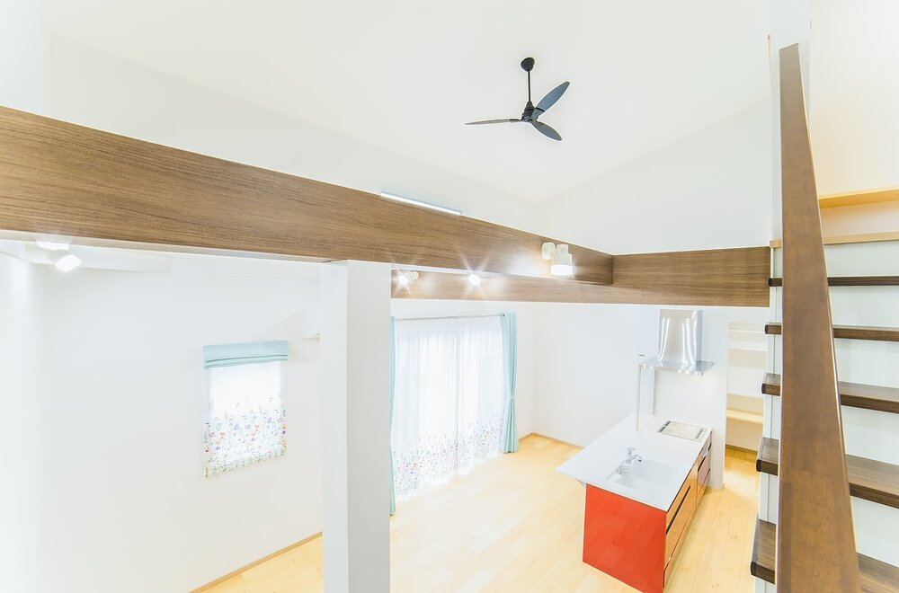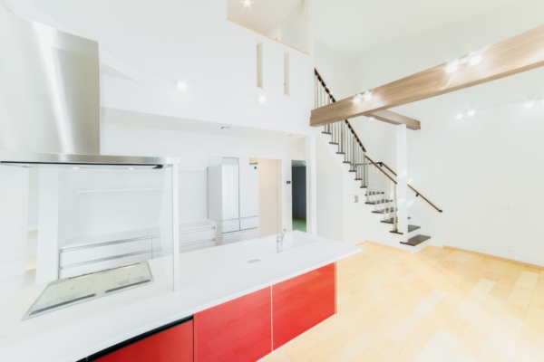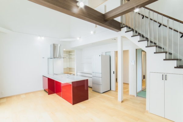 大きな吹抜けと飾り梁、赤のキッチンが印象的なリビング。階段下は収納に活用し、空間を無駄にしない設計。