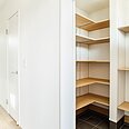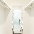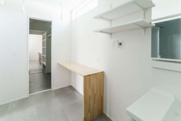 造作のカウンター・室内干し用バー・横付けのクロークを設け、洗濯・干す・たたむが一貫して行える空間に。