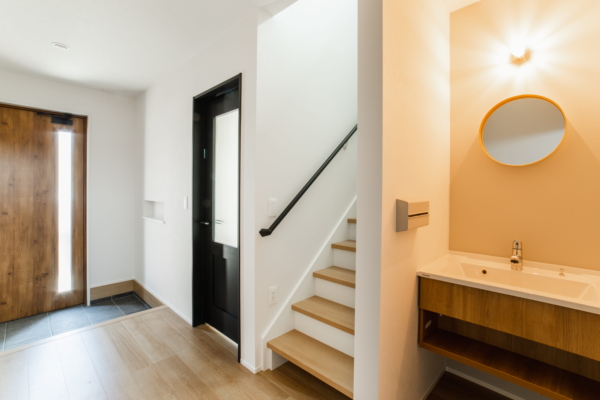 帰宅後にすぐ寄れるただいま手洗い。来客時にも、わざわざ洗面所へ案内する必要もない点も魅力。丸いミラーと照明のあかりがお洒落。
