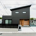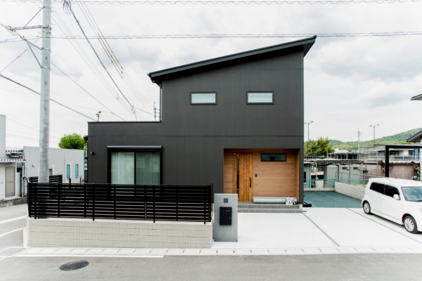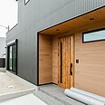 片流れ屋根でスタイリッシュにまとまった外観。玄関周りの木目がアクセントとなり、シンプルながら、、永く愛される外観に。