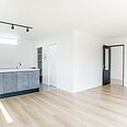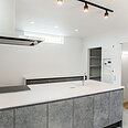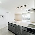 リビングと床材を変えることで雰囲気をがらりとチェンジ。フラットなペニンシュラキッチンで広々開放的にお料理を楽しめます。