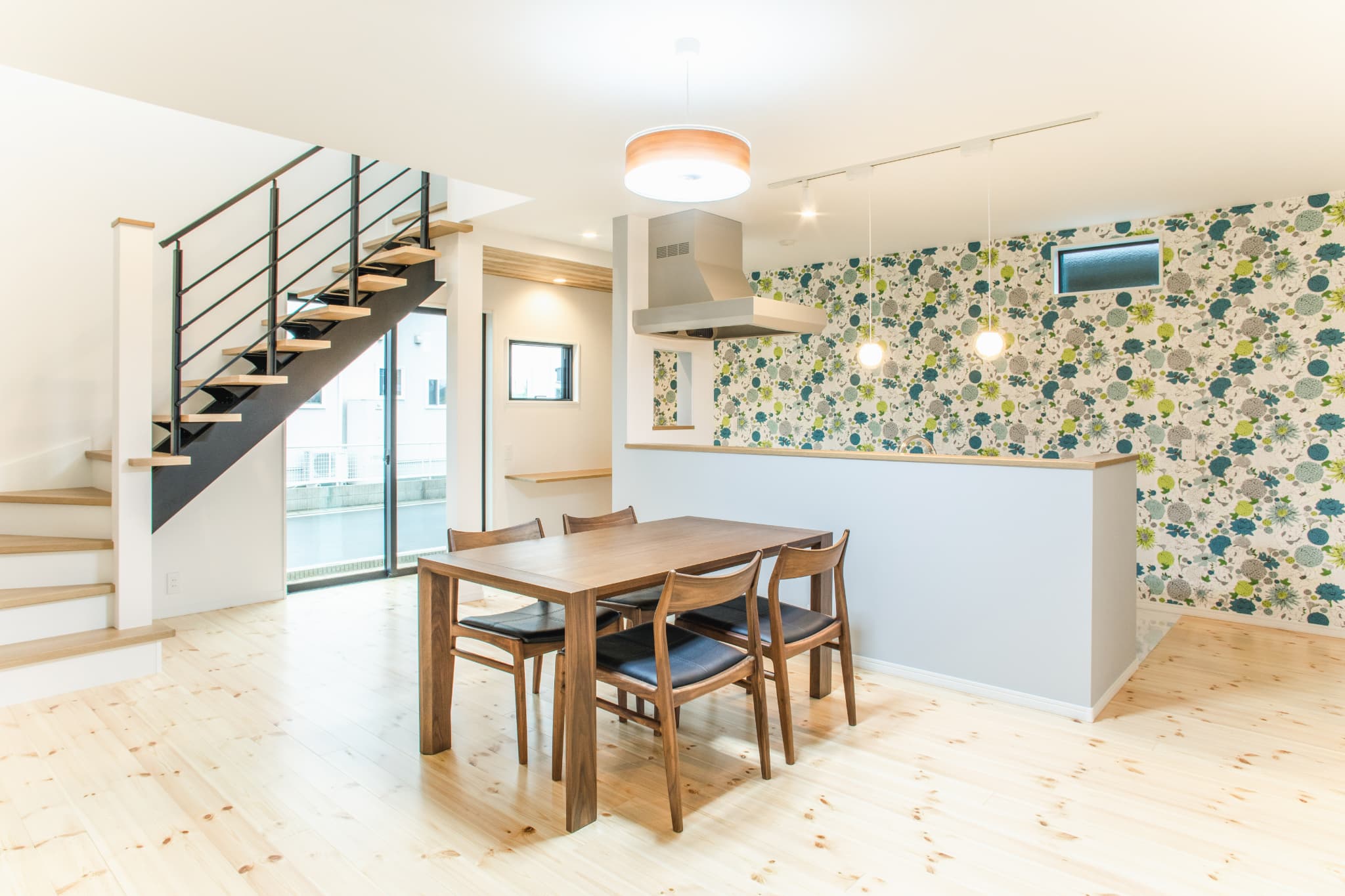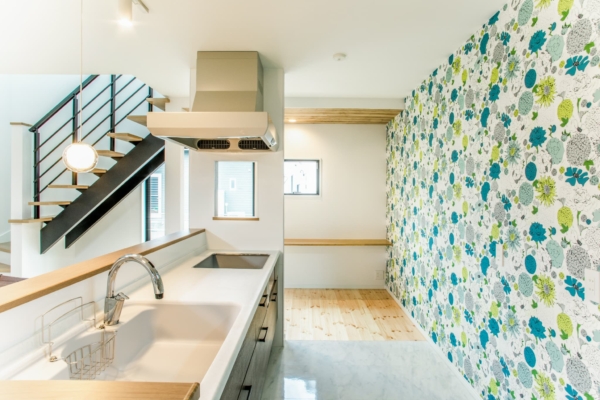 アクセントクロスが華やかであたたかいリビング。奥のカウンターやリビング階段など、こだわりが詰まった空間。