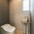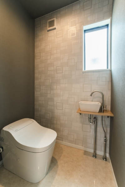 グレーのクロスで落ち着いた空間に。洗面カウンターはあえて配管を見せるスタイルで個性を演出。