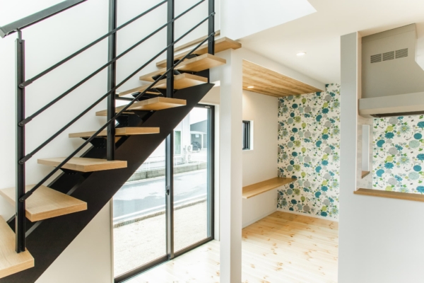 階段は圧迫感のないデザインに。黒が温かみのあるLDKにコントラストを生み、お洒落な印象へ。