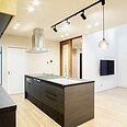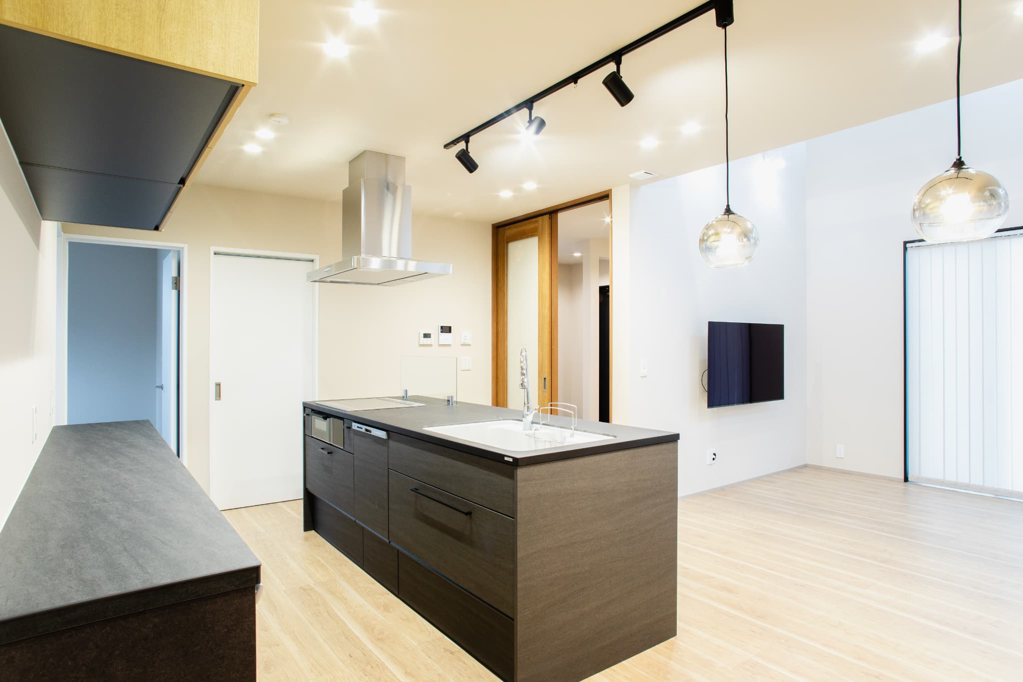 壁掛けテレビを採用し、すっきりとした空間に。キッチンはアイランドで回遊動線が叶います。