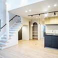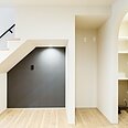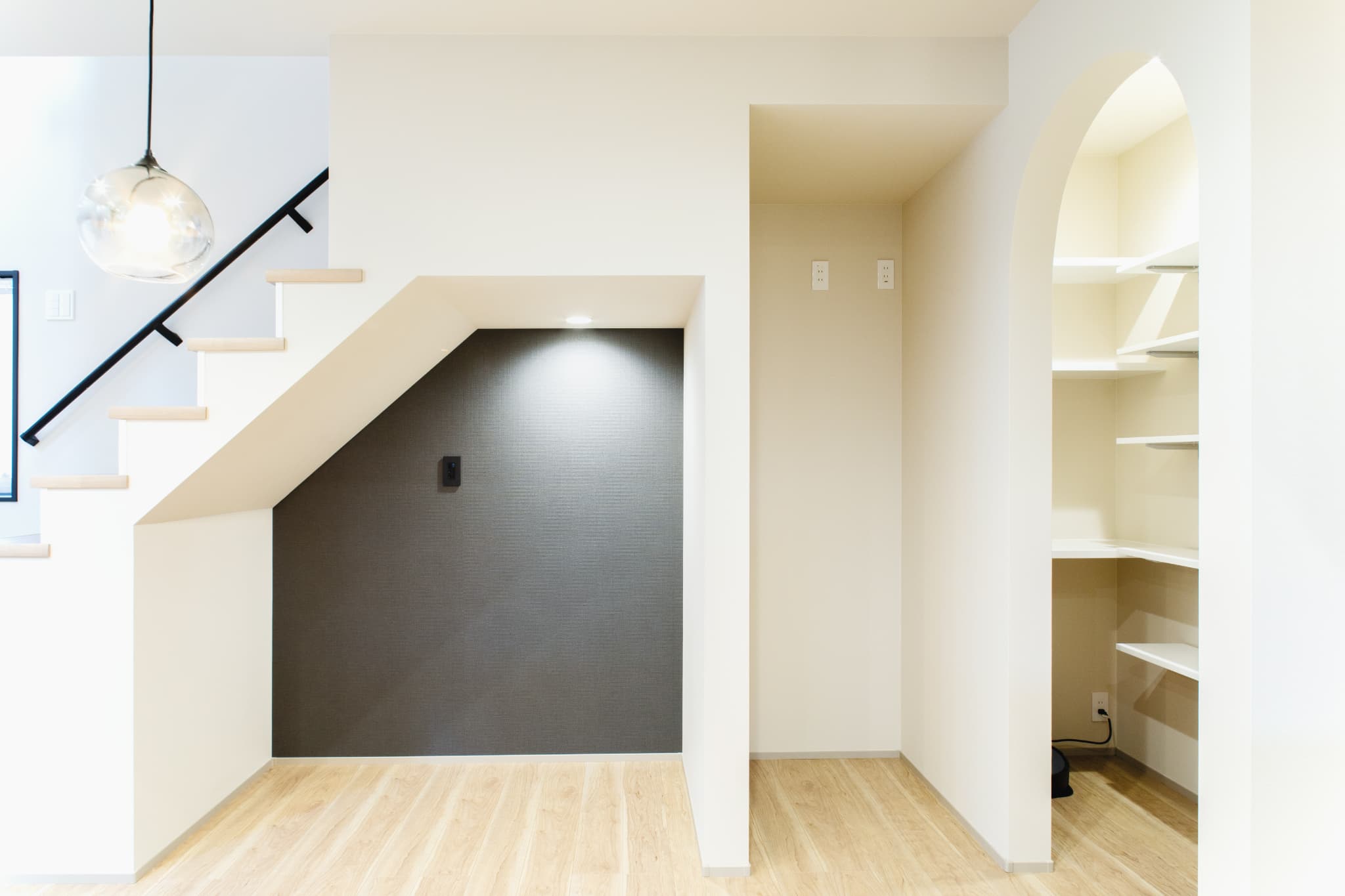 アーチの下がり壁が印象的なパントリーと、階段下のスペースには落ち着くヌックがあり目を引きます✨️
