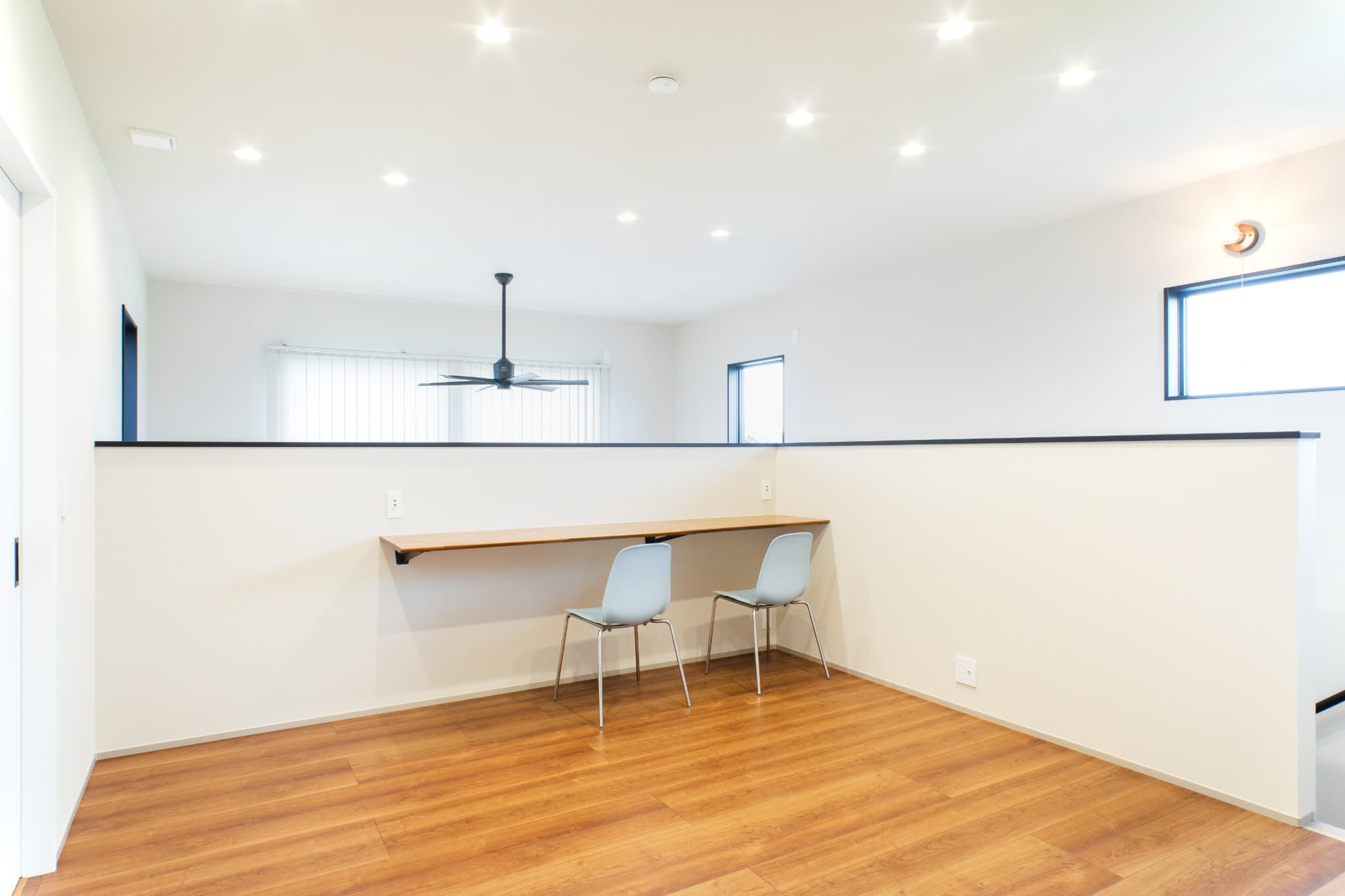 吹抜けが気持ちいい二階ホールにはカウンターを設けました。ここでは、お子様が宿題をしたり、ゆっくり読書をしたりと楽しめます。