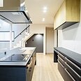 黒で統一したキッチンは、空間を締め、スタイリッシュなかっこいい空間に。背面にも収納たっぷりです。