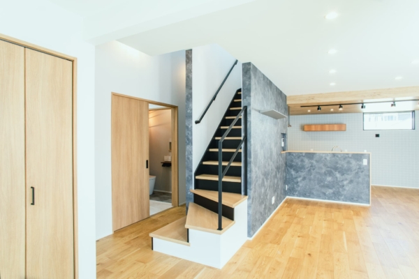 リビング階段で会話広がる、石目調×木の家