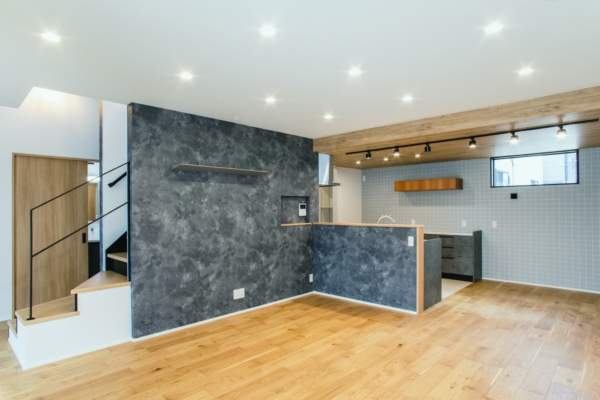 【石目調×木の組み合わせ/2階建】リビングに階段のある温かい家