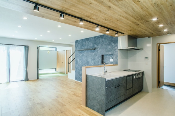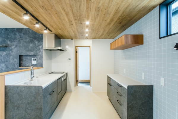 木目と石目調を使いこなし、お洒落なキッチン。カップボード上にも木の棚を設け、デザイン性・機能性を考えた設計。奥にはパントリーも。