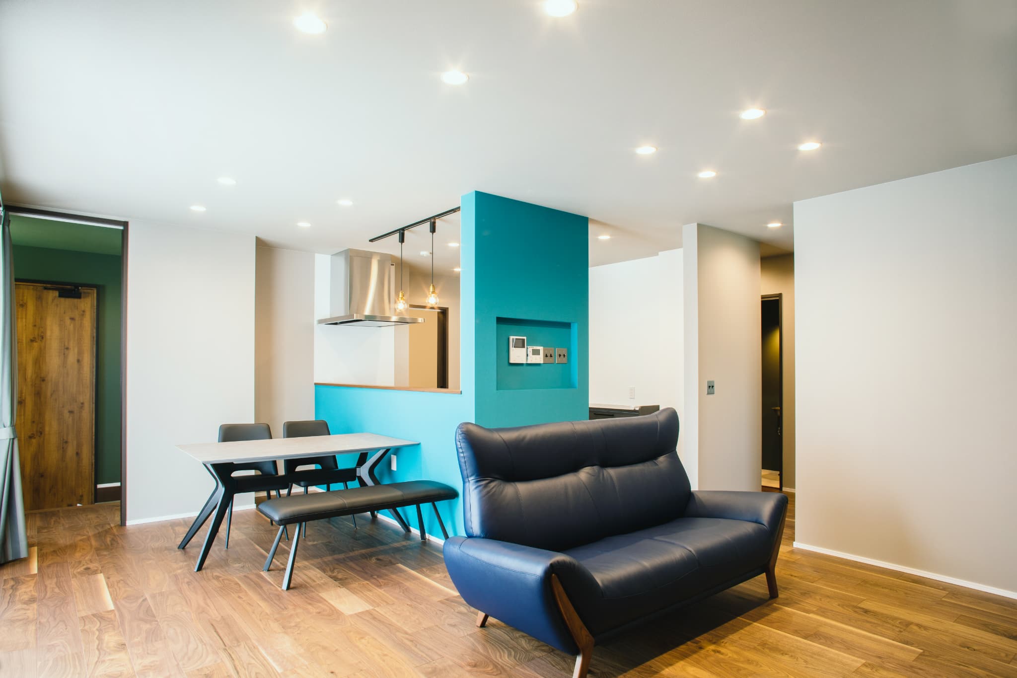 差し色にキッチン周りのターコイズブルーのクロスとブラックウォールナットの床材で、落ち着きすぎてしまうLDKも彩りの良い空間に仕上がります。