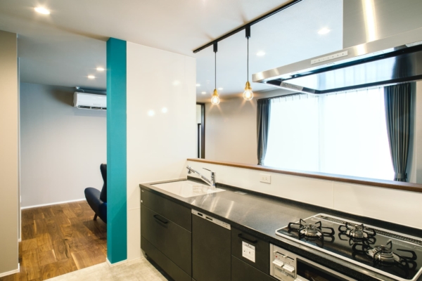 ブラックウォールナットの床とブラックの対面キッチンを基調に、キッチン周りのターコイズブルーがアクセントになったLDK。