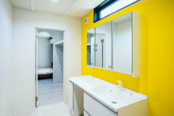リビングとは対照的に、洗面室は鮮やかなイエロー。色使いで遊び心がみられ、素敵な仕上がりに。