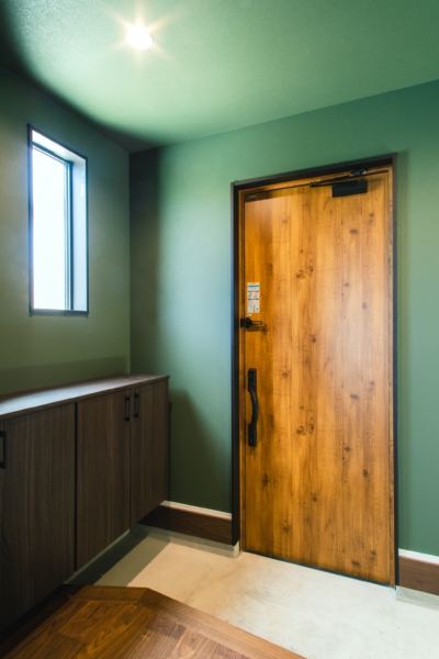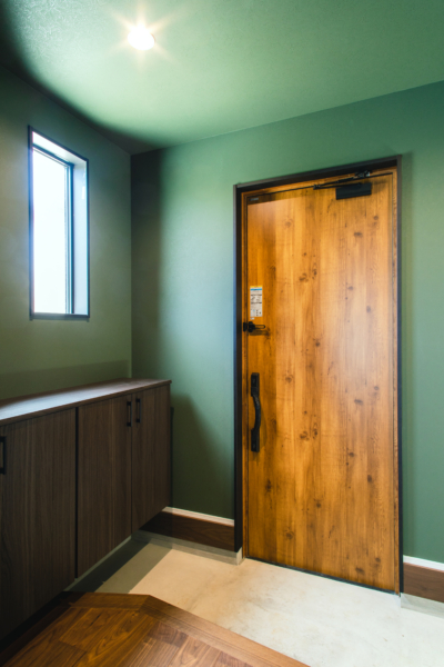 玄関ドアのキャメルブラウンが、グリーンのクロスに映えています。