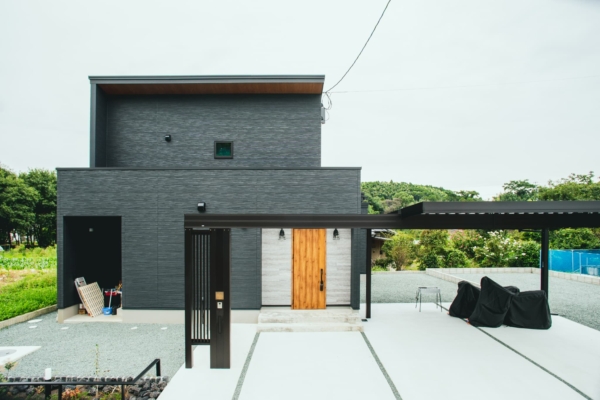 ブラックの外壁に玄関ドアの明るい色がアクセントとなり、洗練された印象に。